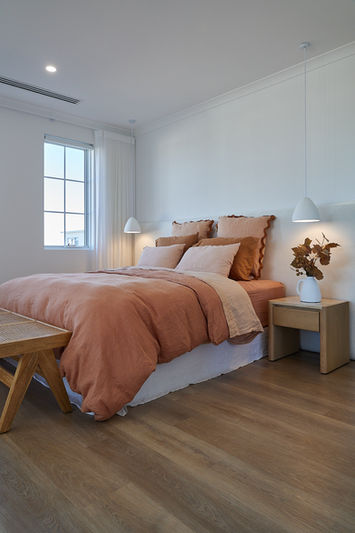 A calm and inviting retreat, the master suite is designed with comfort and elegance in mind. Soft layers of linen and warm timber tones create a soothing palette, while pendant lights add a modern touch. The spacious walk-in robe features bespoke cabinetry and in the ensuite, a freestanding bath sits with double basins, warm brass tapware, and terrazzo flooring enhancing the sense of refined luxury.